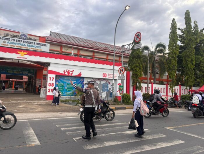 Personel Sat Lantas tampak aktif membantu penyeberangan warga, mengurai potensi kemacetan, serta memantau situasi jalan guna mencegah terjadinya gangguan kelancaran berlalu lintas.