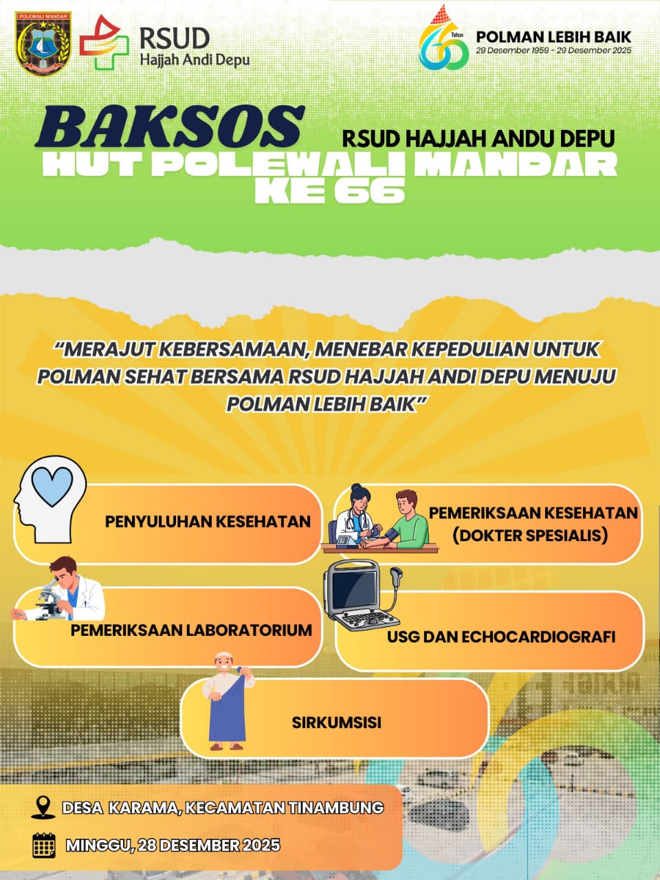 “Melalui kegiatan bakti sosial ini, kami berharap dapat membantu masyarakat memperoleh akses pelayanan kesehatan yang berkualitas sekaligus mempererat kebersamaan dalam momentum peringatan HUT Polewali Mandar ke-66,” ujarnya.